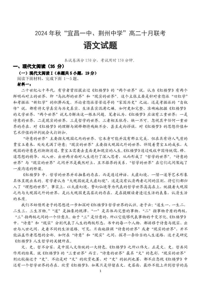 湖北省2024年秋”宜昌一中、荆州中学“高二十月联考语文