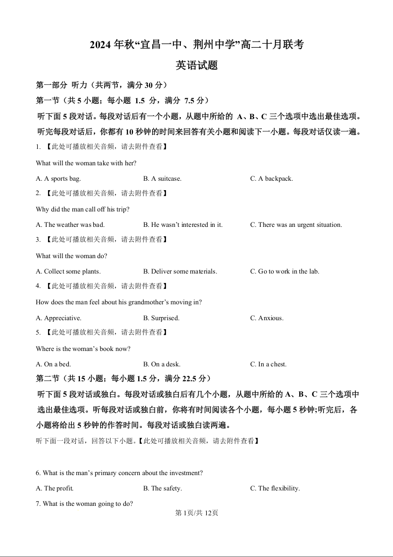 湖北省2024年秋”宜昌一中、荆州中学“高二十月联考英语试卷(原卷版)