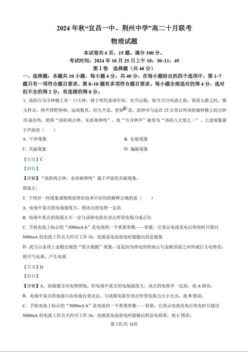 湖北省2024年秋”宜昌一中、荆州中学“高二十月联考物理试卷(解析版)