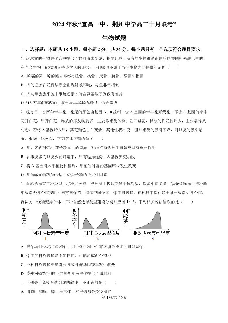 湖北省2024年秋”宜昌一中、荆州中学“高二十月联考生物试卷(原卷版)