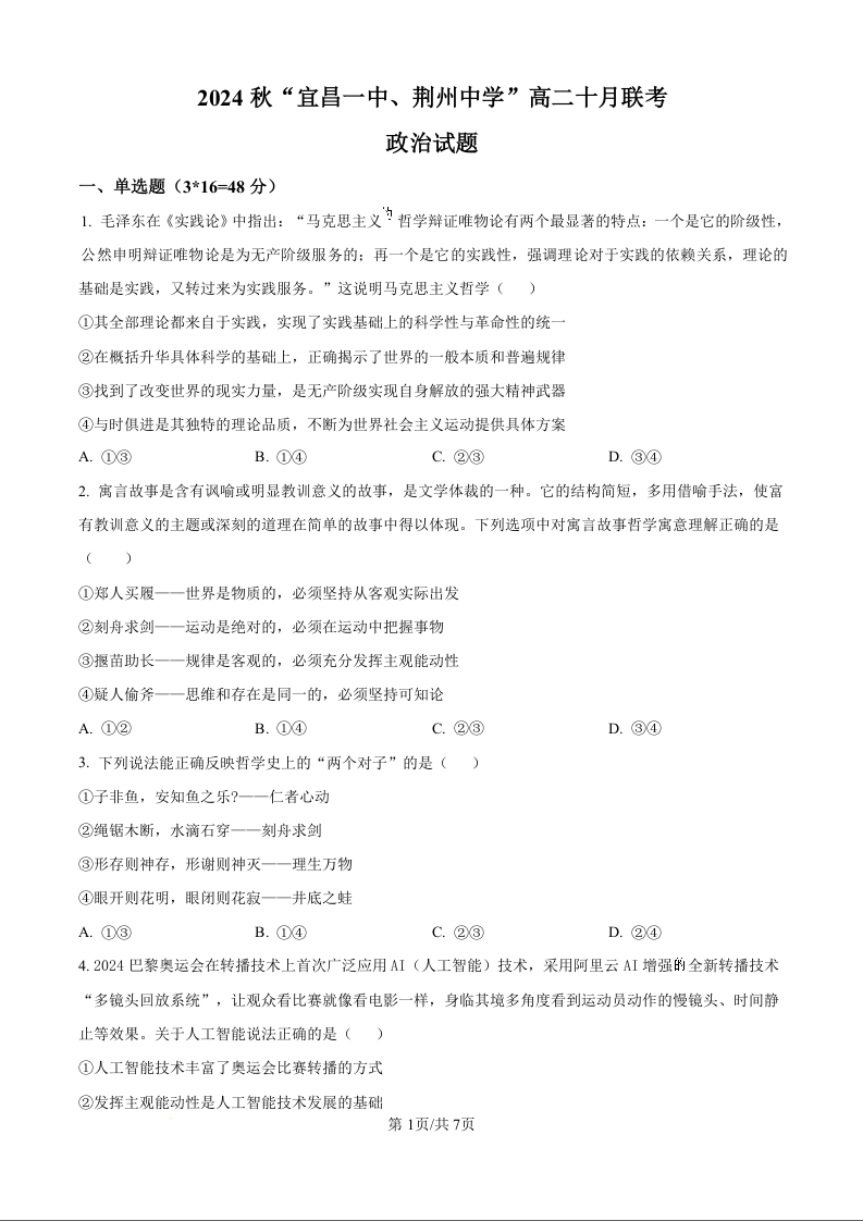 湖北省2024年秋”宜昌一中、荆州中学“高二十月联考政治试卷(原卷版)