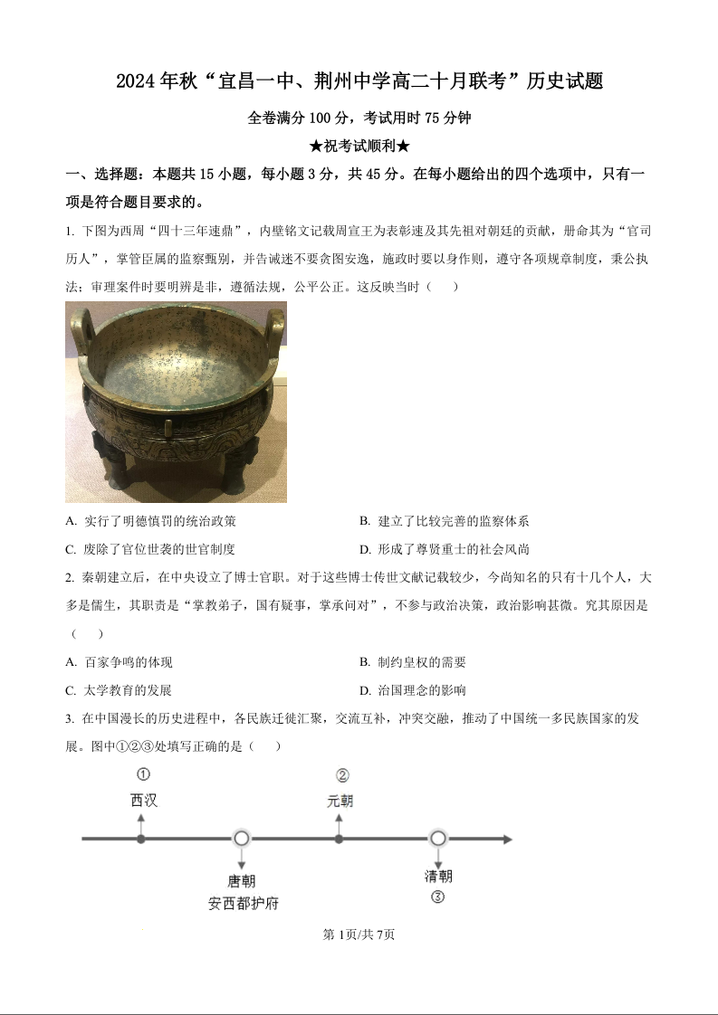 湖北省2024年秋”宜昌一中、荆州中学“高二十月联考历史试卷(原卷版)