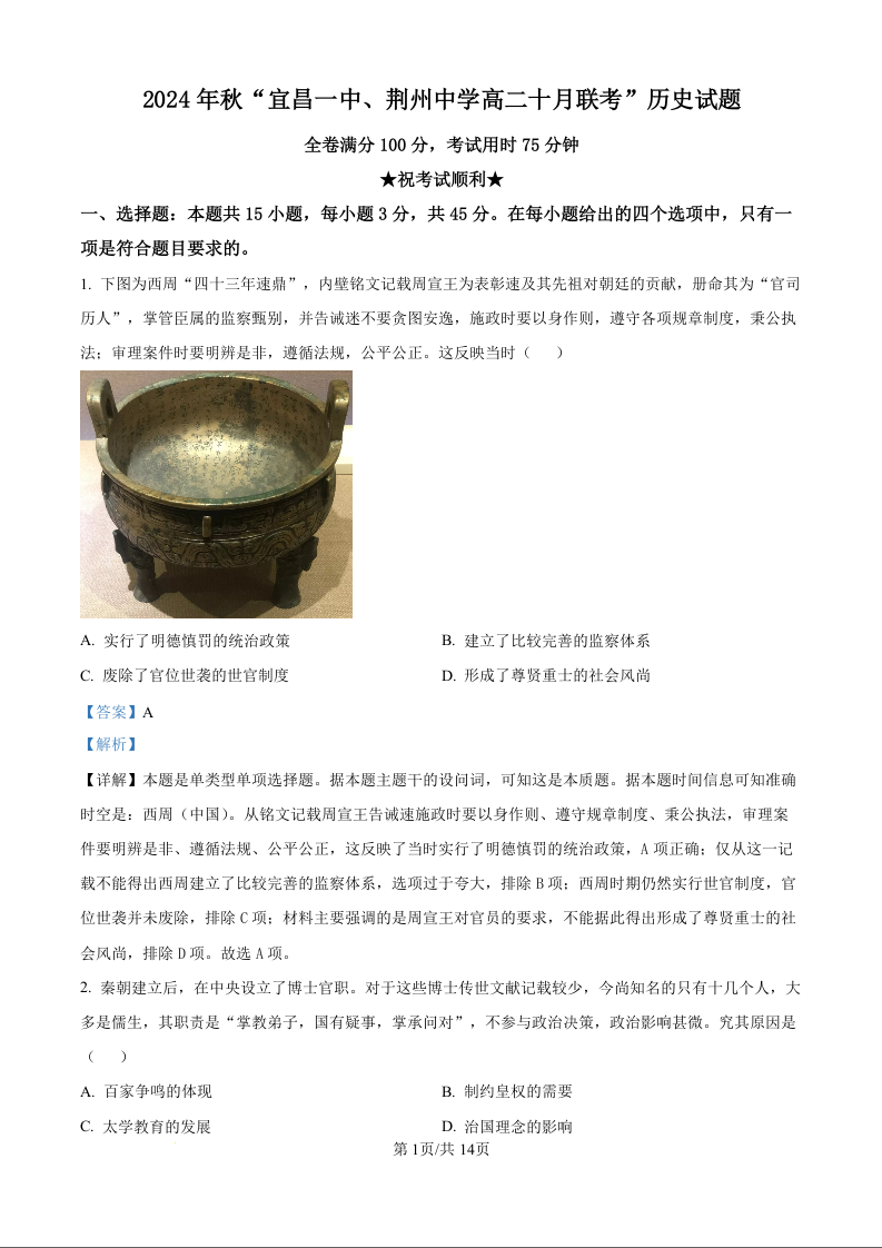 湖北省2024年秋”宜昌一中、荆州中学“高二十月联考历史试卷(解析版)