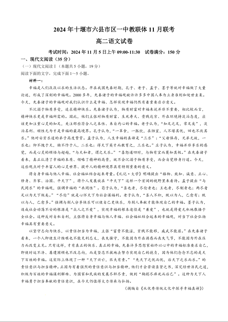 湖北省2024年十堰市六县市区一中教联体11月高二联考试卷语文+答案
