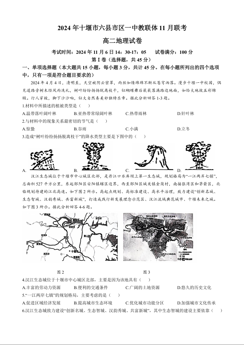 湖北省2024年十堰市六县市区一中教联体11月高二联考试卷地理+答案
