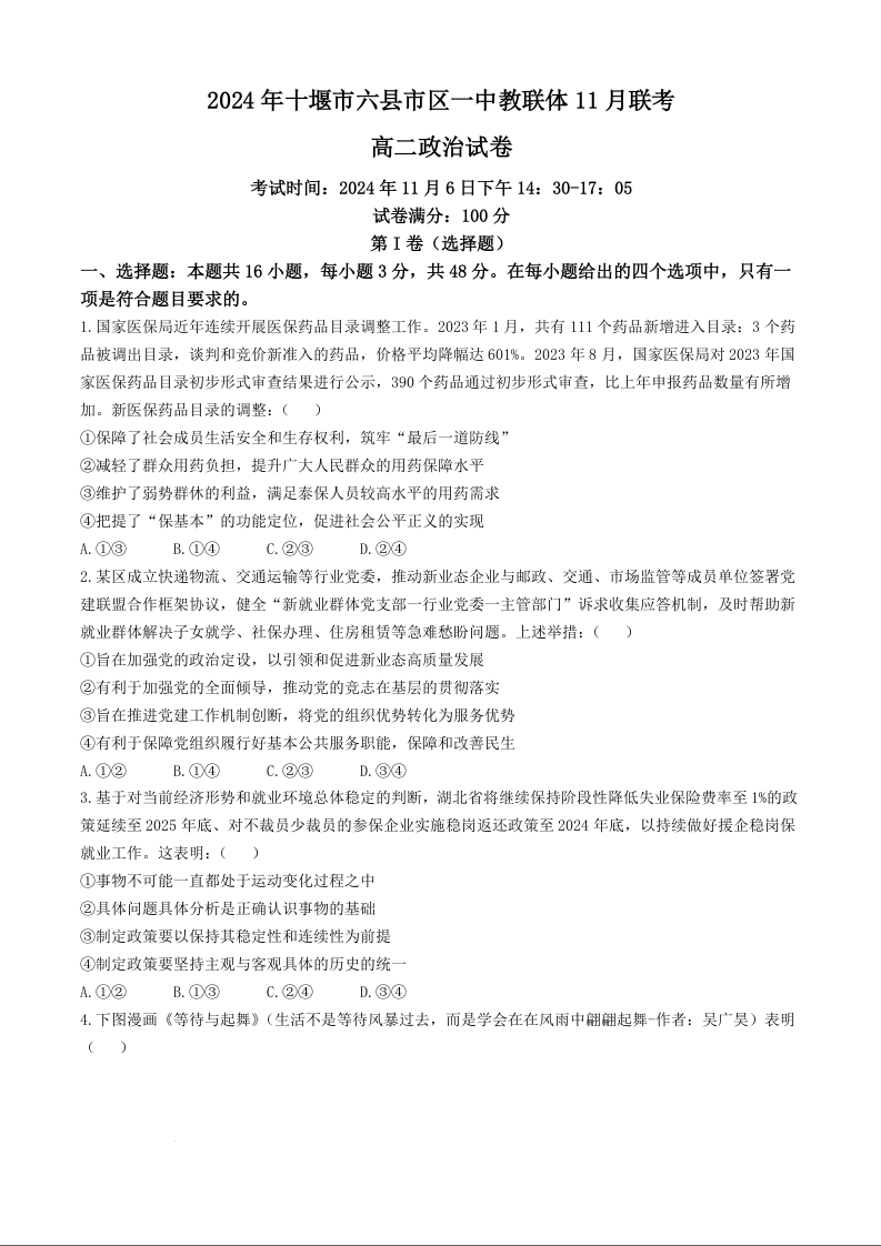 湖北省2024年十堰市六县市区一中教联体11月高二联考试卷政治+答案