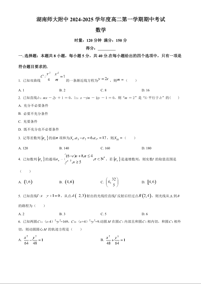 湖南省师大附中2024-2025学年度高二第一学期期中考试数学