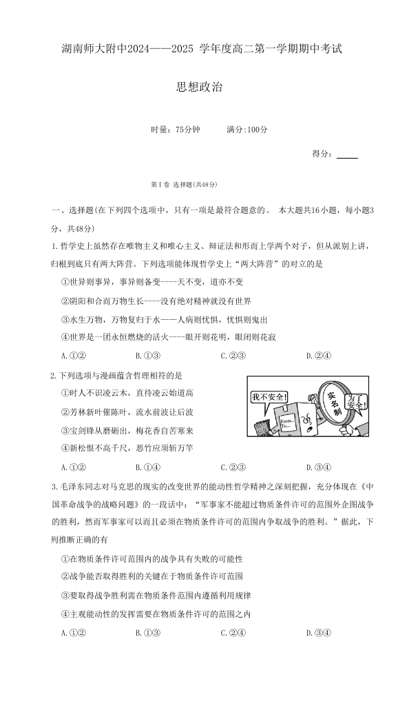 湖南省师大附中2024-2025学年度高二第一学期期中考试政治