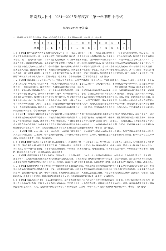 湖南省师大附中2024-2025学年度高二第一学期期中考试政治答案