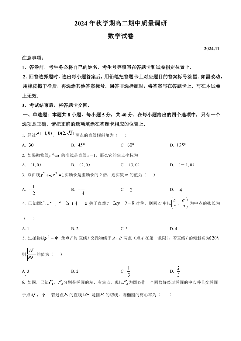 江苏省常州市2024年秋学期高二期中质量检测数学试题(原卷版)
