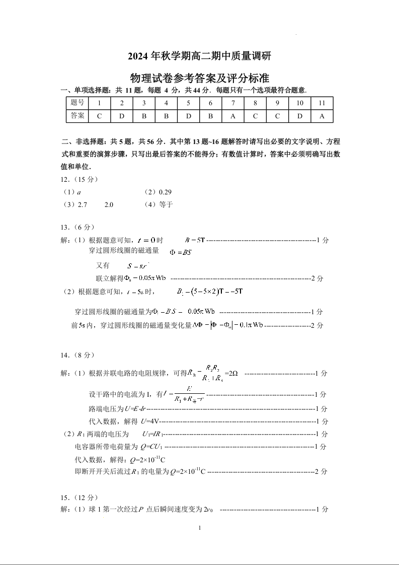 江苏省常州市2024年秋学期高二期中质量检测物理答案