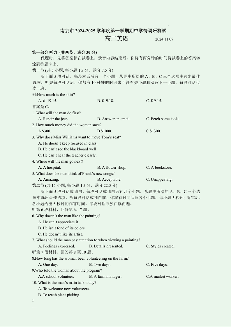 江苏省南京市2024-2025学年度第一学期期中学情调研测试英语