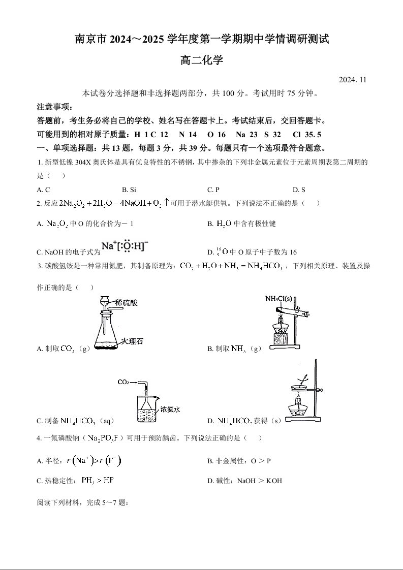 江苏省南京市2024-2025学年度第一学期期中学情调研测试化学