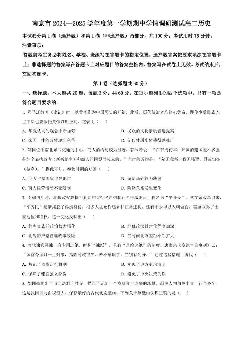 江苏省南京市2024-2025学年度第一学期期中学情调研测试历史