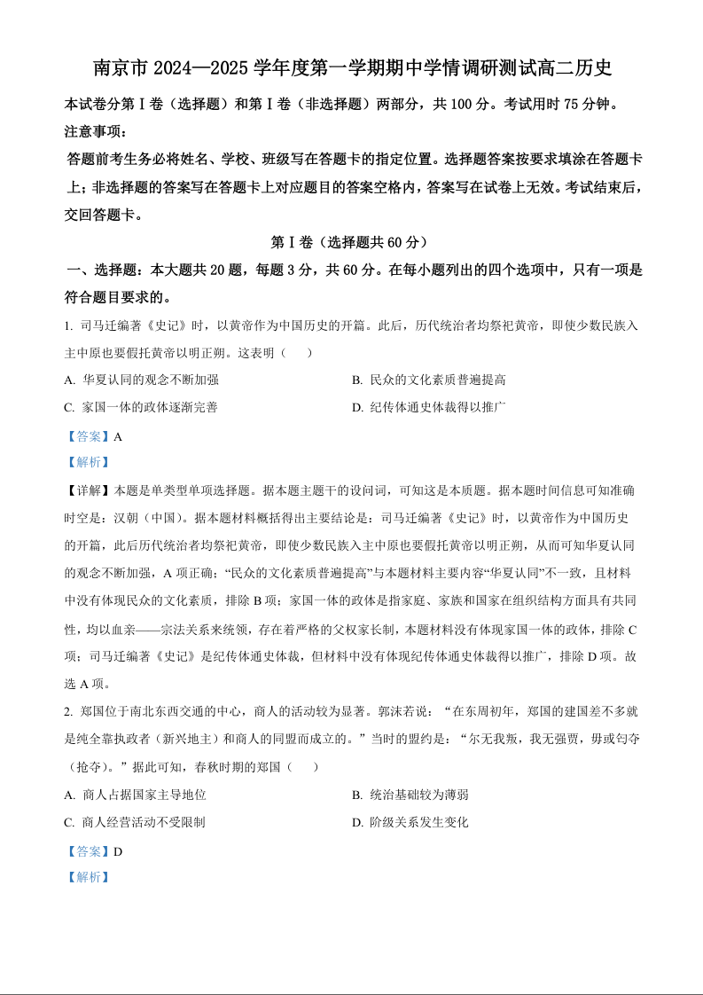 江苏省南京市2024-2025学年度第一学期期中学情调研测试历史+答案