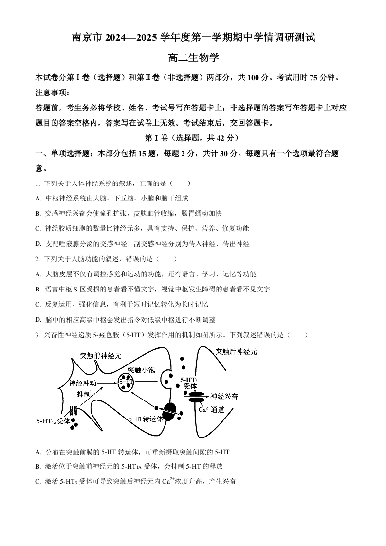 江苏省南京市2024-2025学年度第一学期期中学情调研测试生物