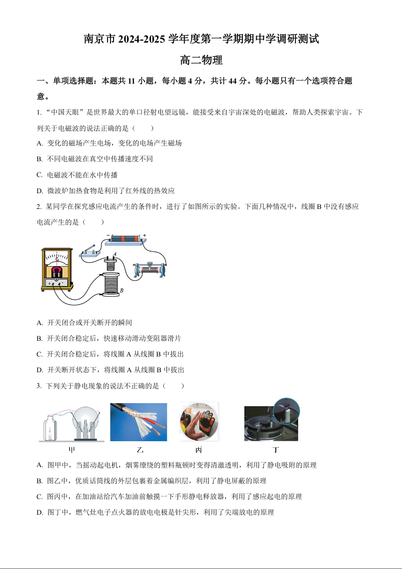 江苏省南京市2024-2025学年度第一学期期中学情调研测试物理