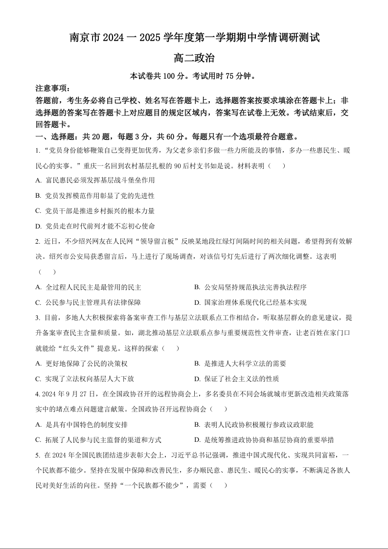 江苏省南京市2024-2025学年度第一学期期中学情调研测试政治
