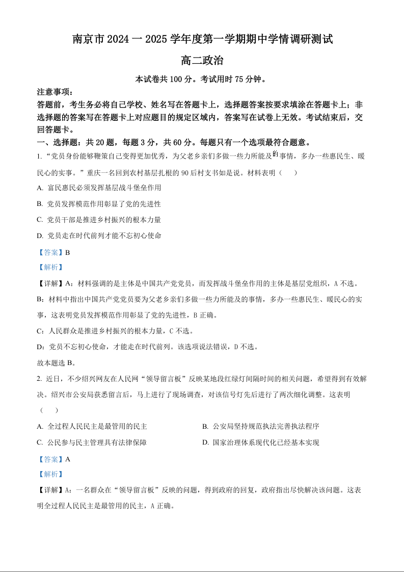 江苏省南京市2024-2025学年度第一学期期中学情调研测试政治+答案