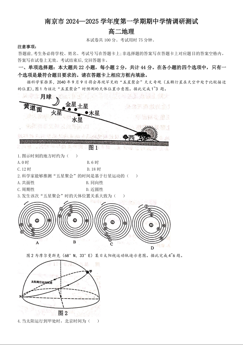 江苏省南京市2024-2025学年度第一学期期中学情调研测试地理