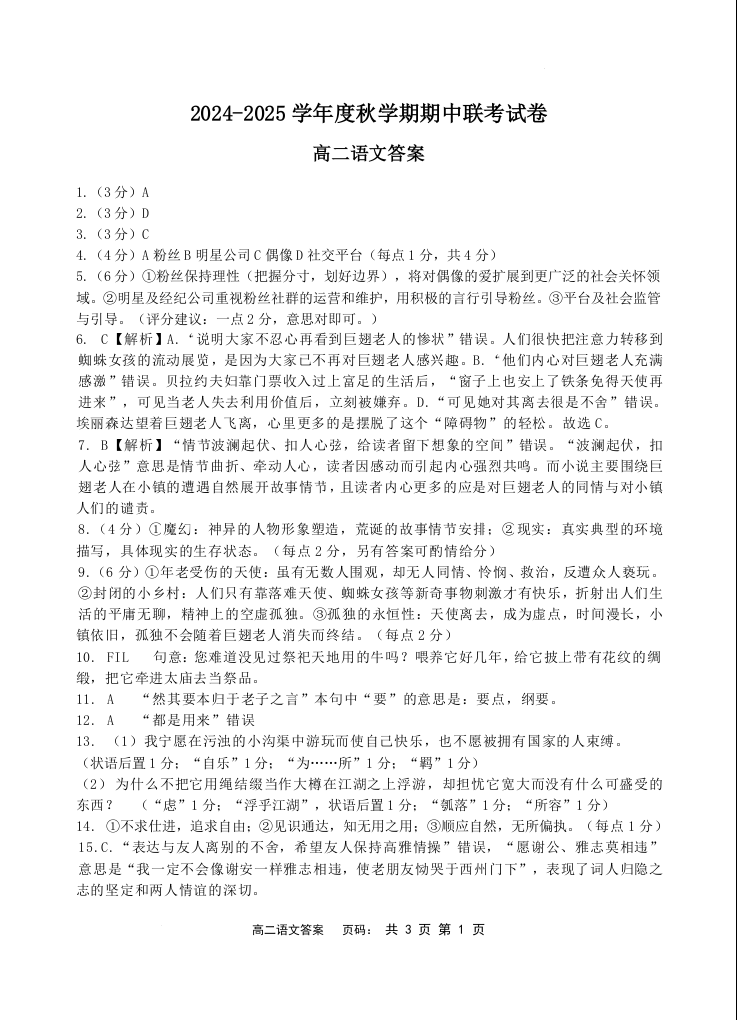 江苏省无锡市江阴市六校2024-2025学年度秋学期期中联考试卷语文答案