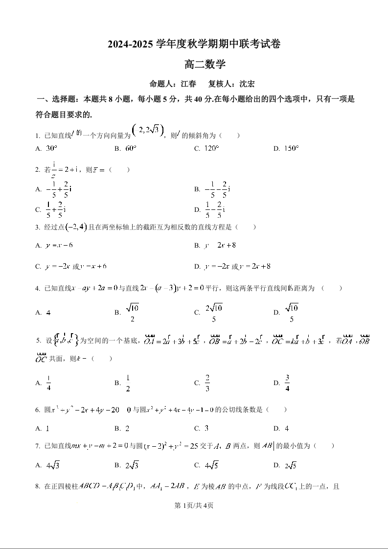 江苏省无锡市江阴市六校2024-2025学年度秋学期期中联考试卷数学试题(原卷版)