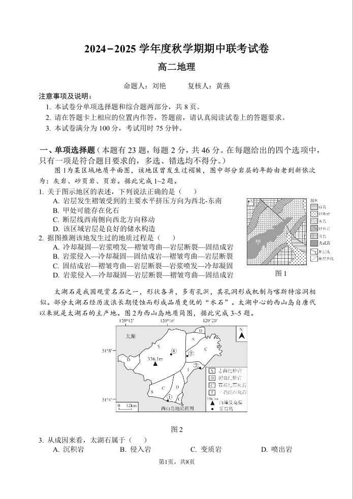 江苏省无锡市江阴市六校2024-2025学年度秋学期期中联考试卷地理