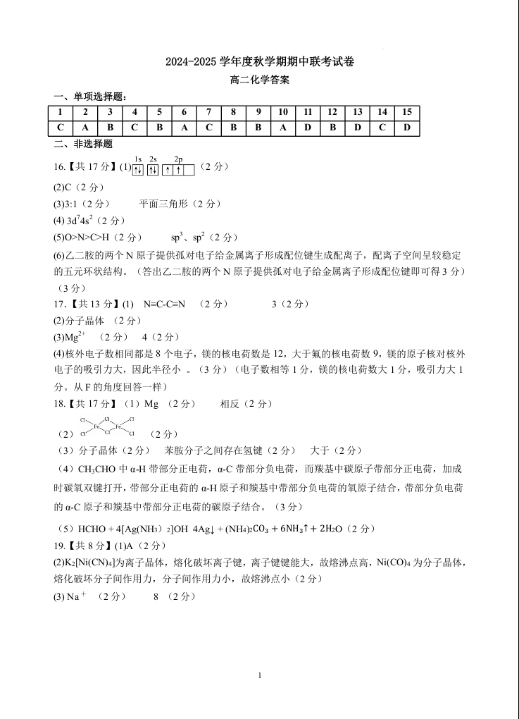 江苏省无锡市江阴市六校2024-2025学年度秋学期期中联考试卷化学答案
