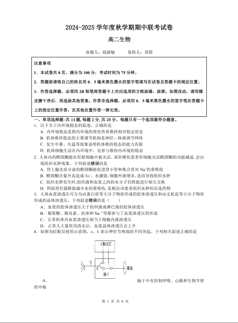 江苏省无锡市江阴市六校2024-2025学年度秋学期期中联考试卷生物