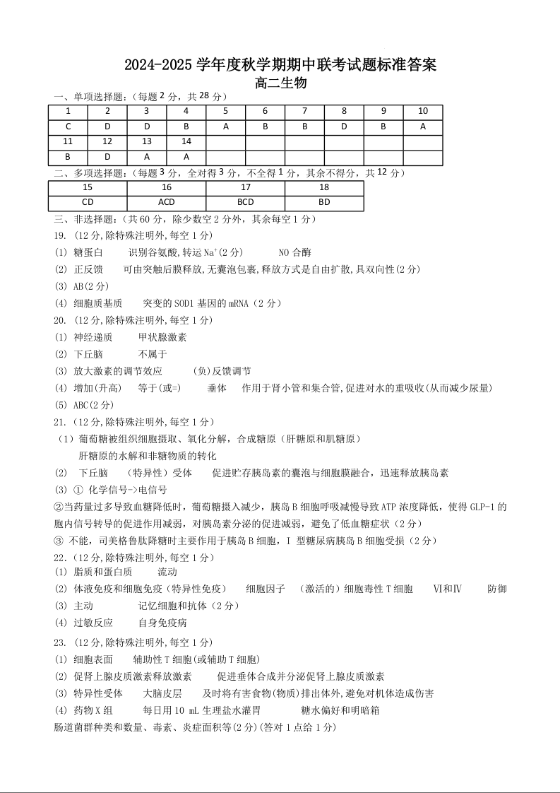 江苏省无锡市江阴市六校2024-2025学年度秋学期期中联考试卷生物答案