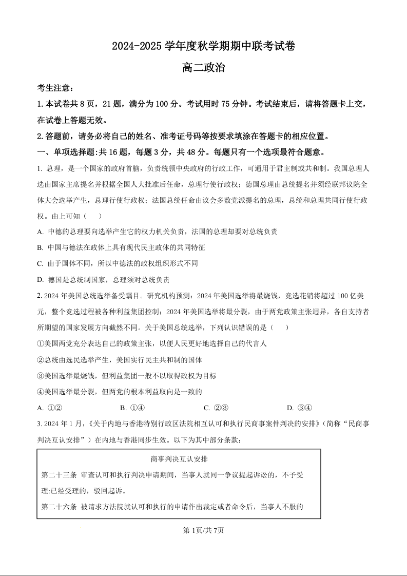 江苏省无锡市江阴市六校2024-2025学年度秋学期期中联考试卷政治试题(原卷版)
