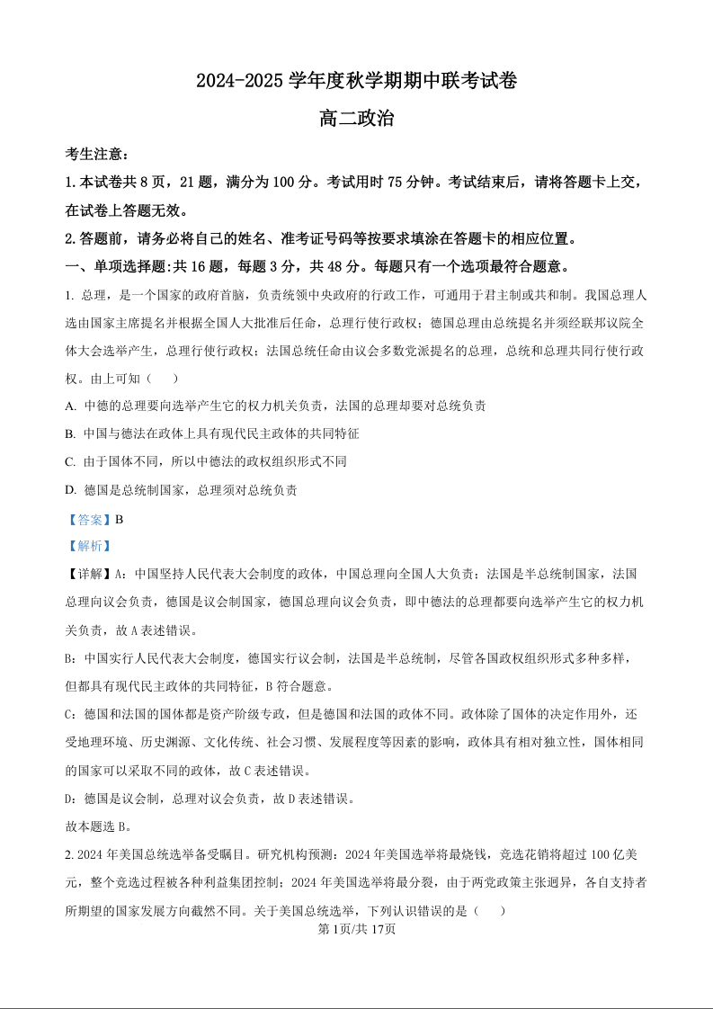 江苏省无锡市江阴市六校2024-2025学年度秋学期期中联考试卷政治试题(解析版)