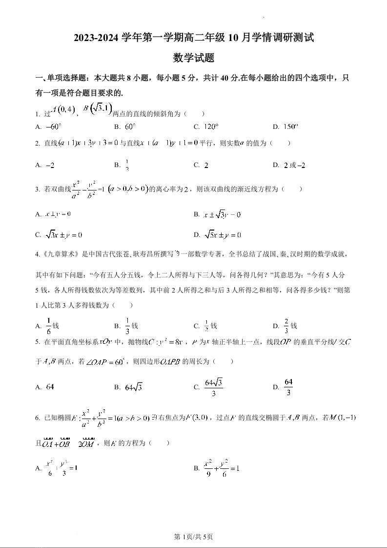 江苏省扬州市高邮市2023-2024学年第一学期高二10月学情调研测试数学试题(原卷版)