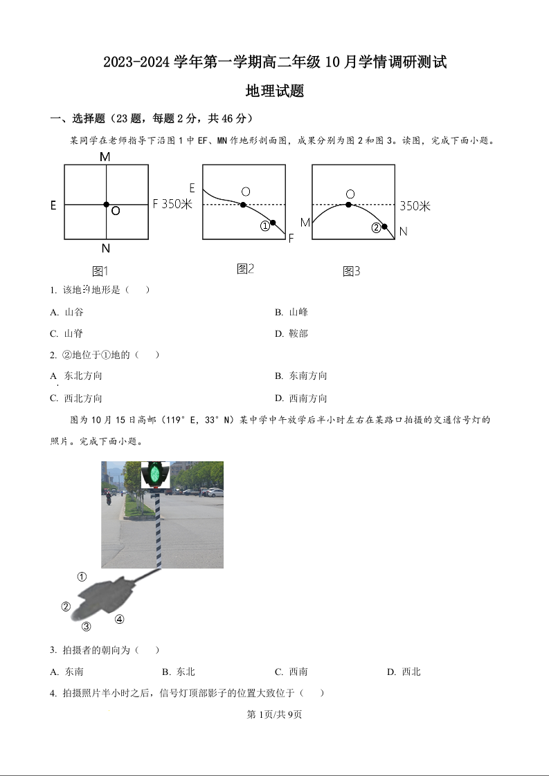 江苏省扬州市高邮市2023-2024学年第一学期高二10月学情调研测试地理试题(原卷版)