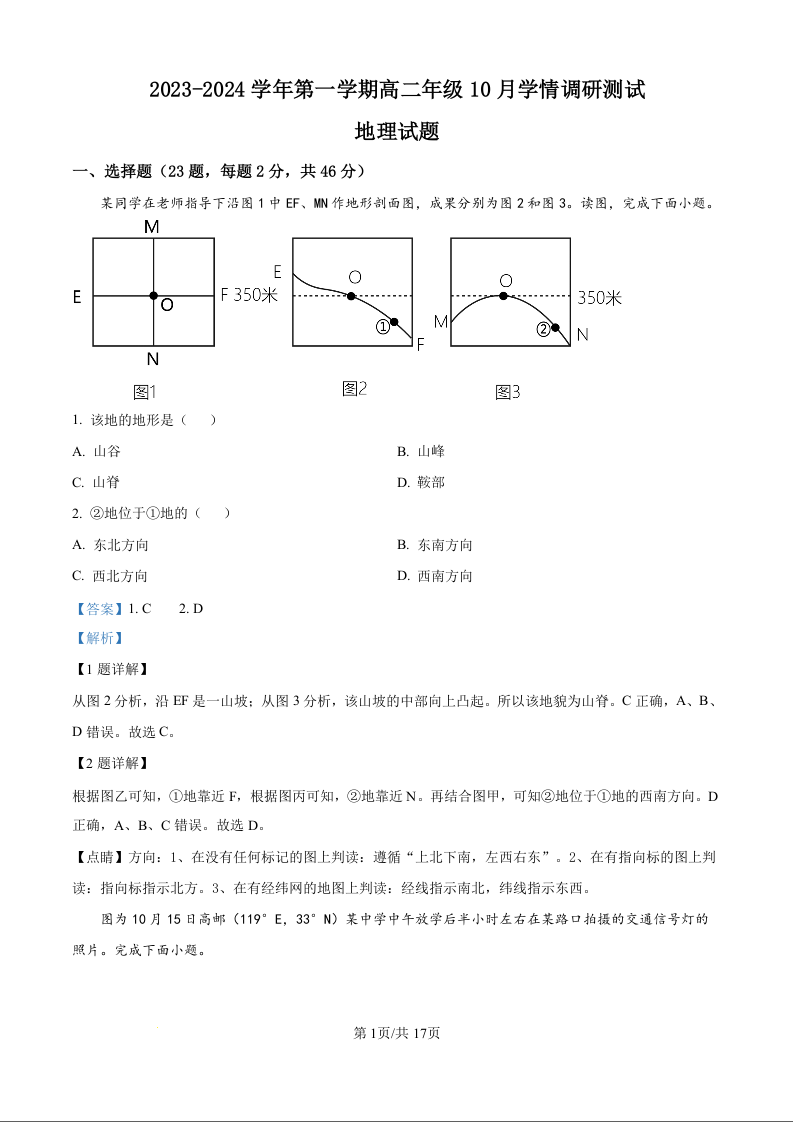 江苏省扬州市高邮市2023-2024学年第一学期高二10月学情调研测试地理试题(解析版)