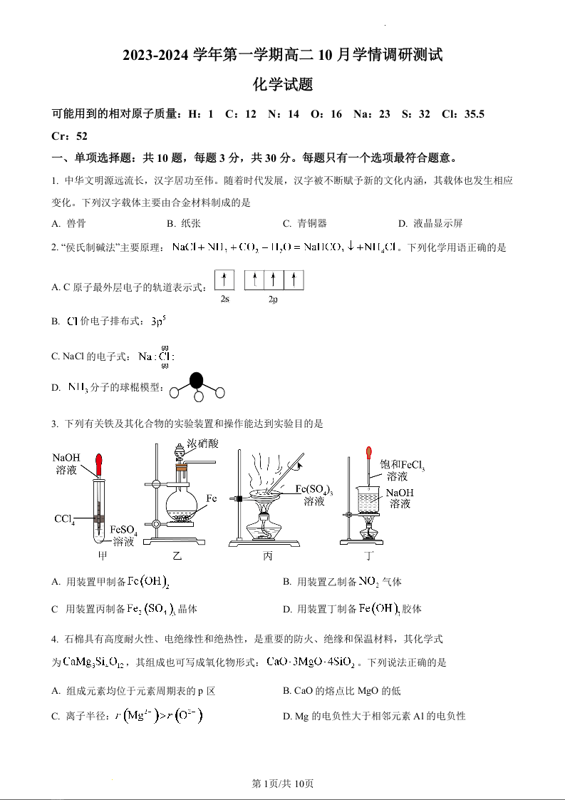 江苏省扬州市高邮市2023-2024学年第一学期高二10月学情调研测试化学试题(原卷版)