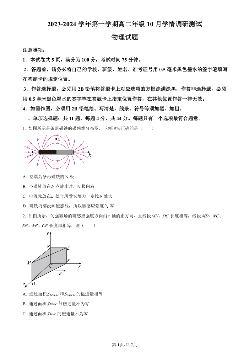 江苏省扬州市高邮市2023-2024学年第一学期高二10月学情调研测试物理试题(原卷版)