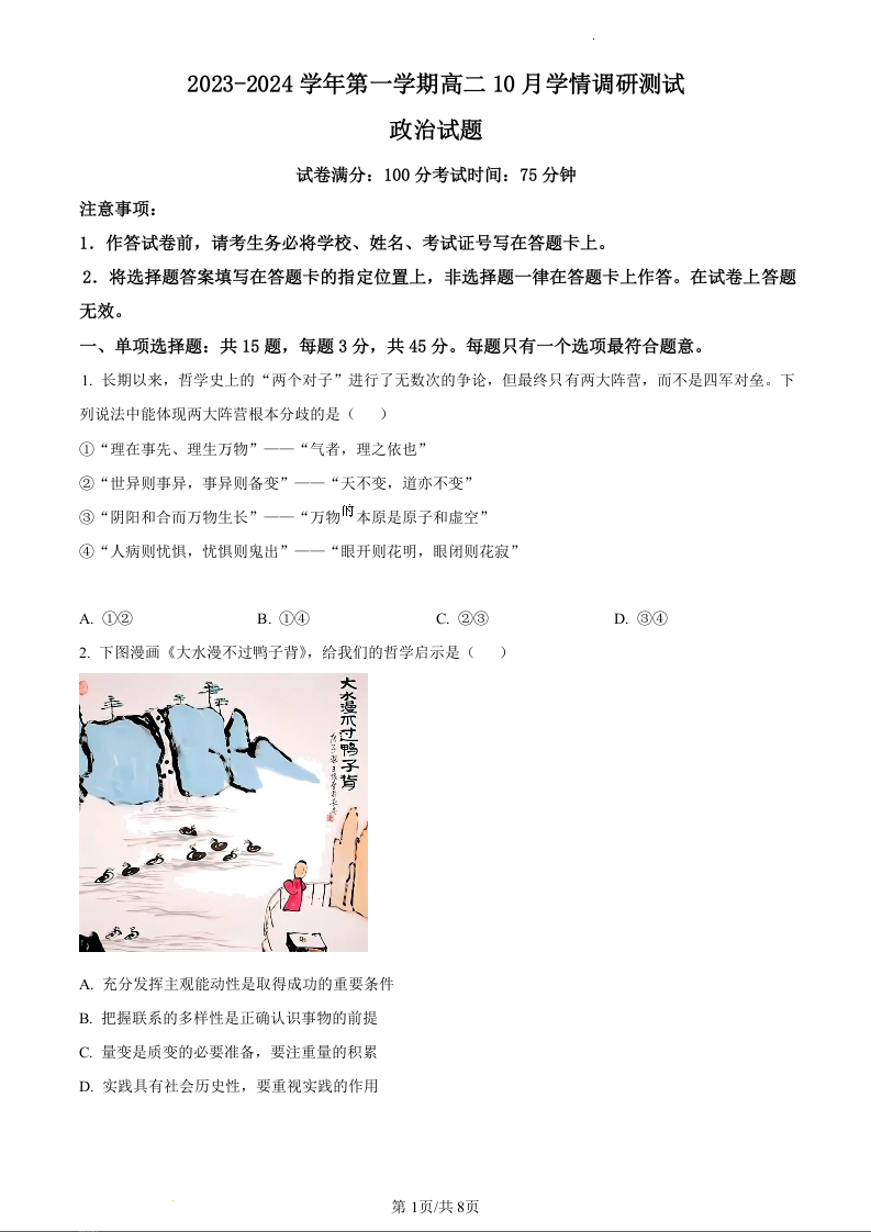 江苏省扬州市高邮市2023-2024学年第一学期高二10月学情调研测试政治试题(原卷版)