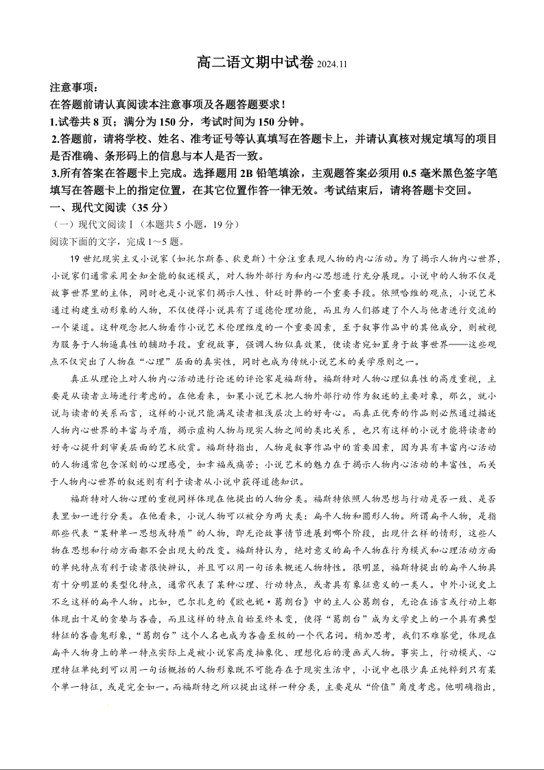 江苏省扬州市江都区2024-2025学年度第一学期期中试卷语文