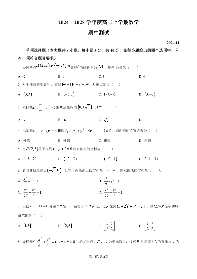 江苏省扬州市江都区2024-2025学年度第一学期期中试卷数学试题(原卷版)