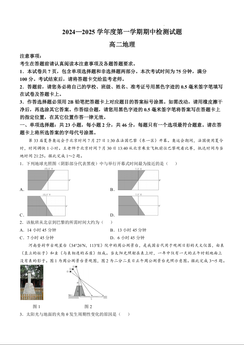 江苏省扬州市江都区2024-2025学年度第一学期期中试卷地理+答案