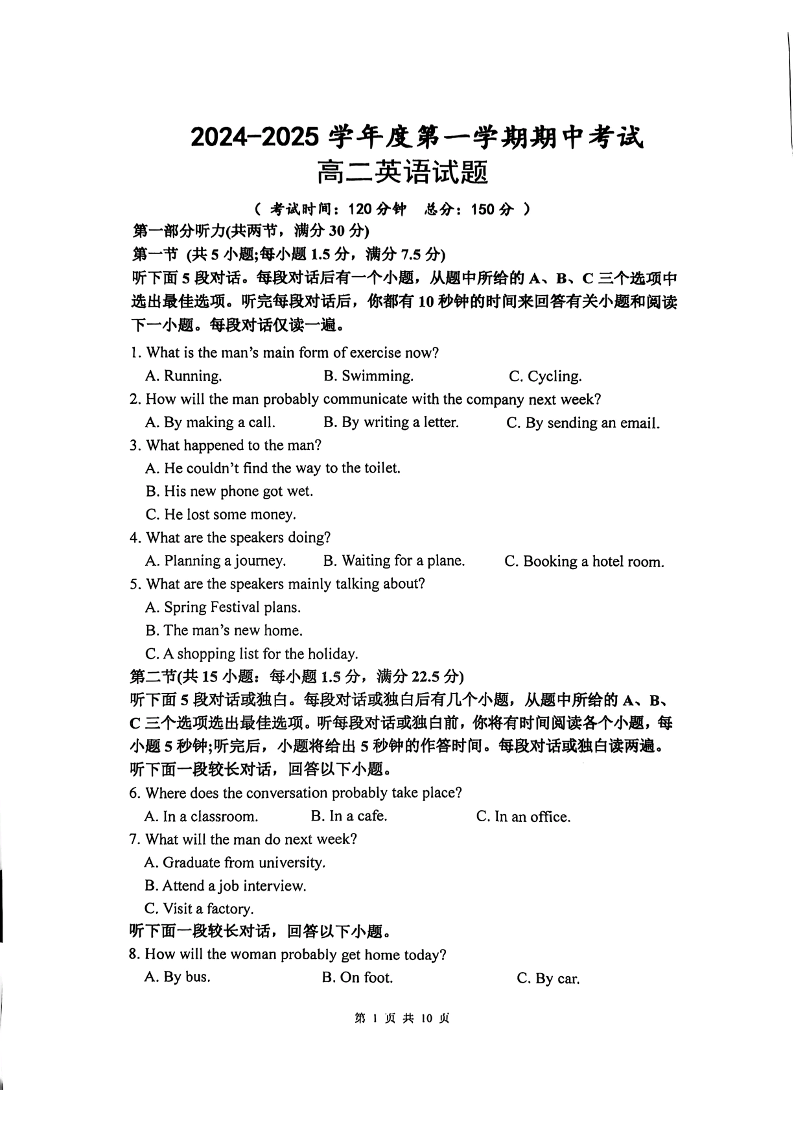 江苏省镇江市三校、泰州市部分学校2024-2025学年度第一学期期中考试英语+答案