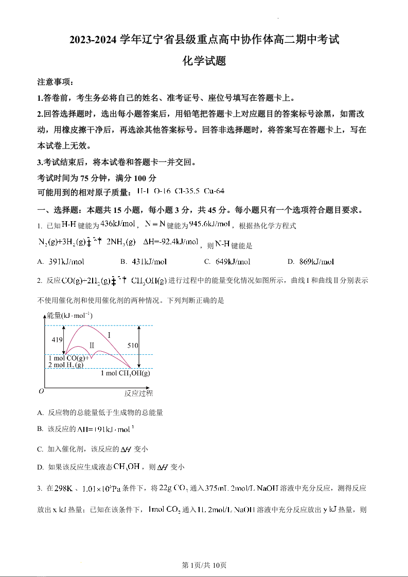 辽宁省县级重点高中协作体2023-2024学年高二上学期期中考试化学试题(原卷版)