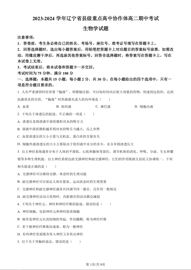 辽宁省县级重点高中协作体2023-2024学年高二上学期期中考试生物试题(原卷版)