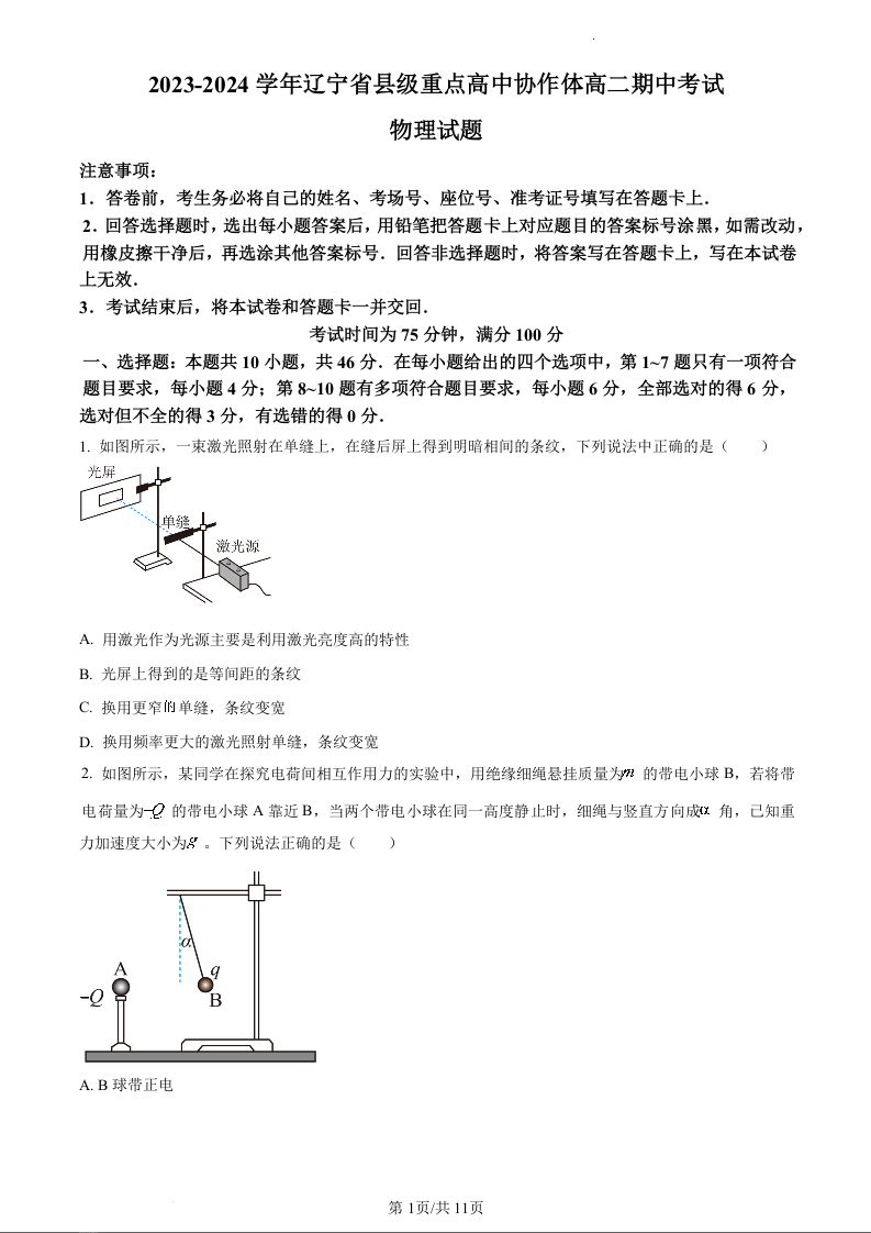 辽宁省县级重点高中协作体2023-2024学年高二上学期期中考试物理+答案