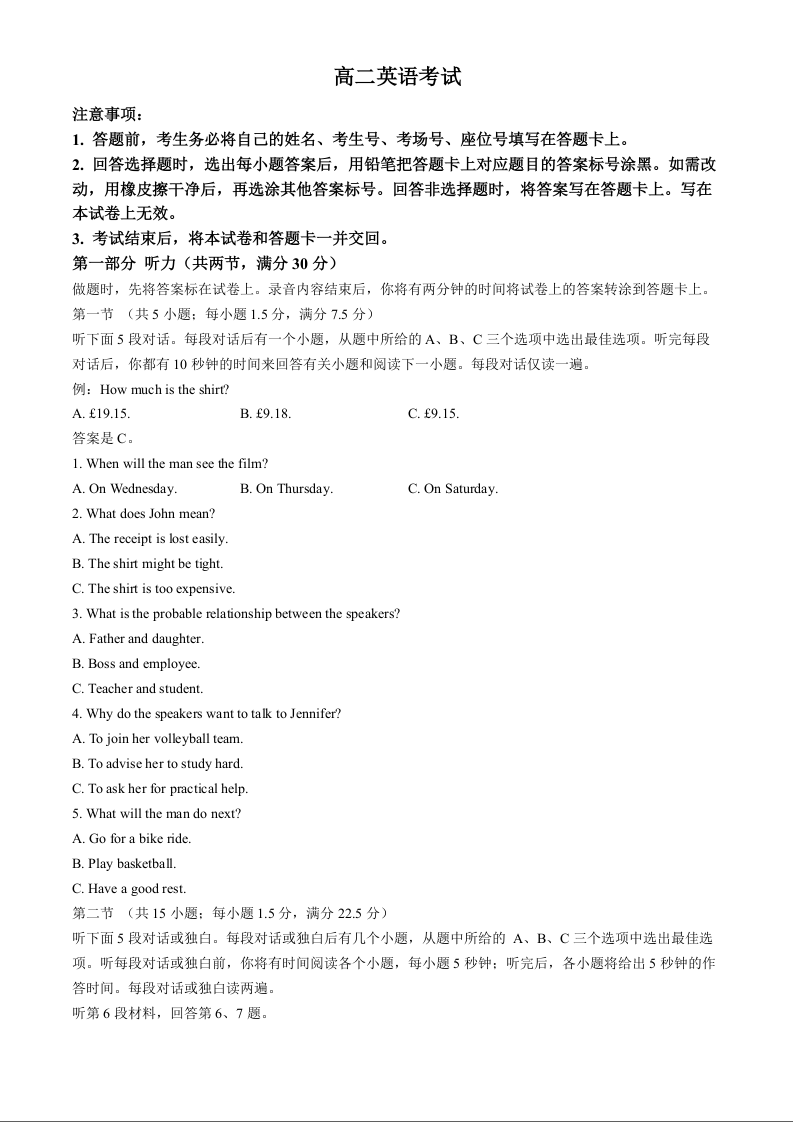 内蒙古赤峰市名校2024-2025学年高二期中联考英语+答案