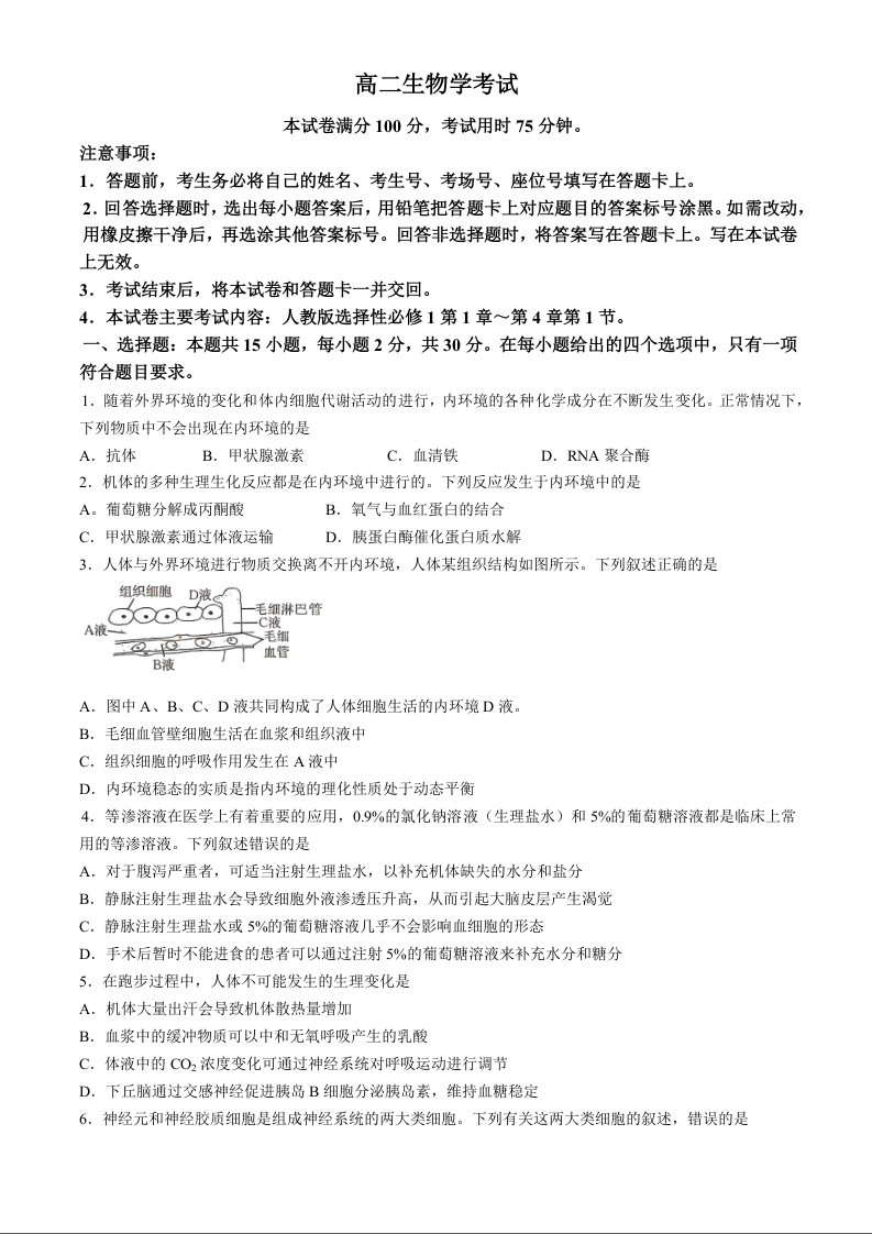 内蒙古赤峰市名校2024-2025学年高二期中联考生物+答案