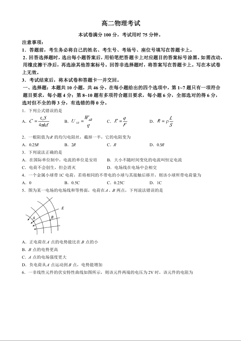 内蒙古赤峰市名校2024-2025学年高二期中联考物理+答案
