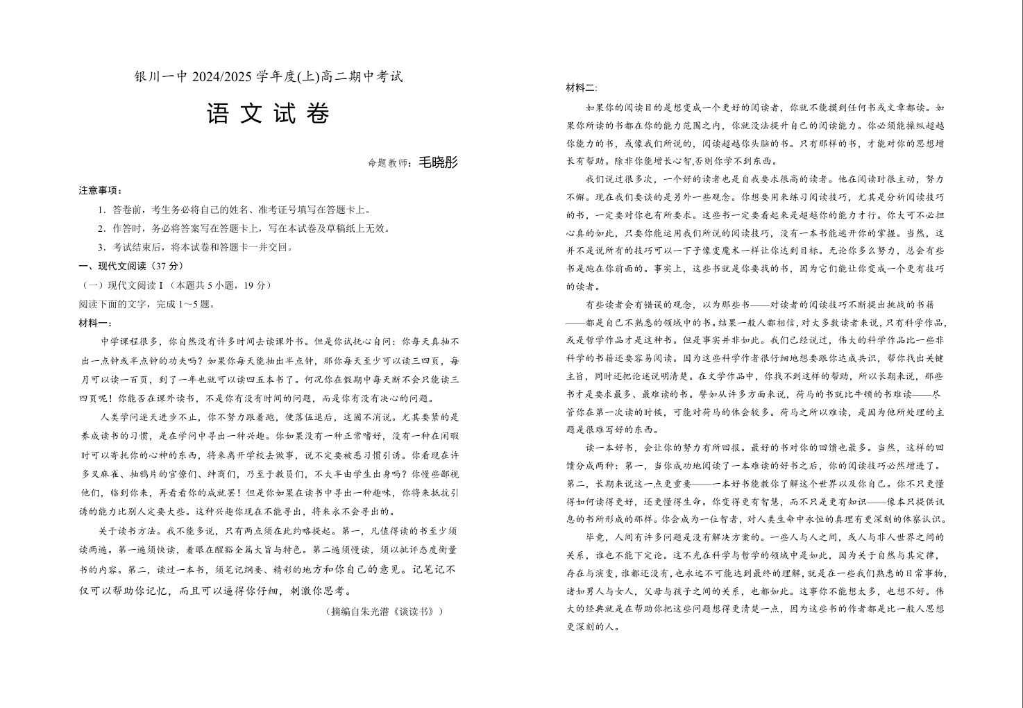 宁夏回族自治区银川一中2024-2025学年度(上)高二期中考试语文+答案