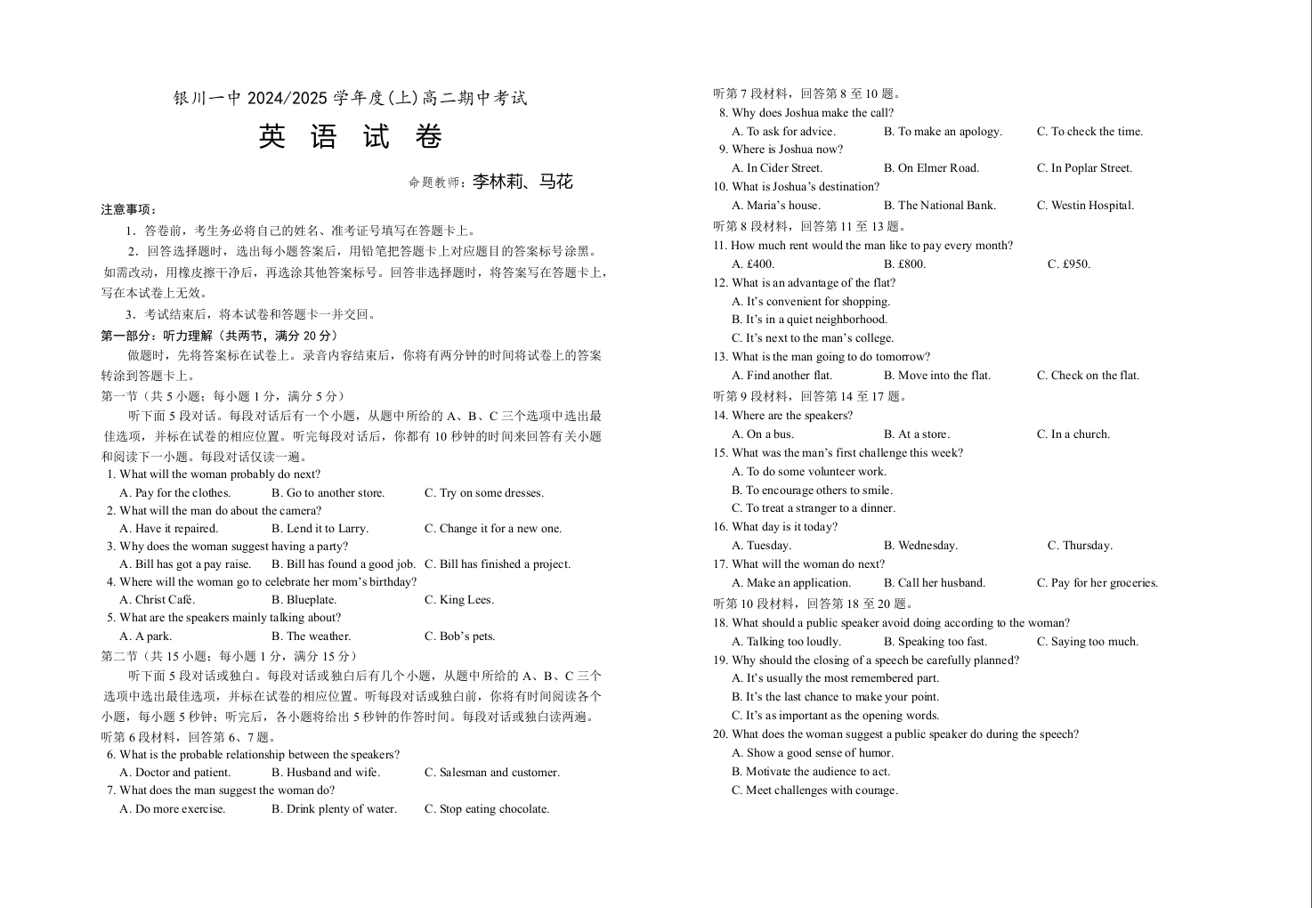 宁夏回族自治区银川一中2024-2025学年度(上)高二期中考试英语+答案